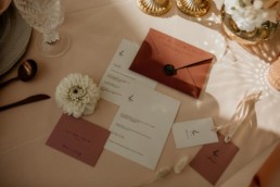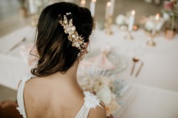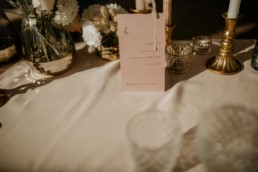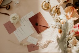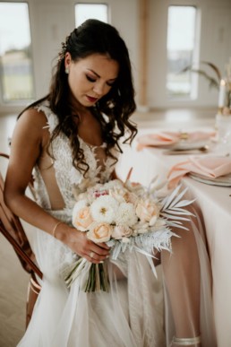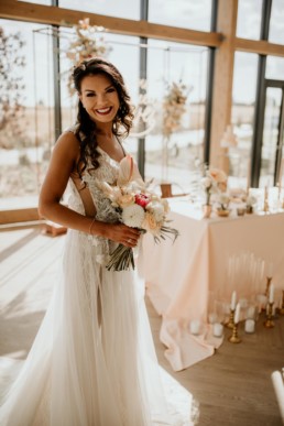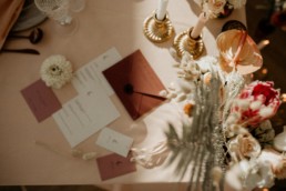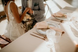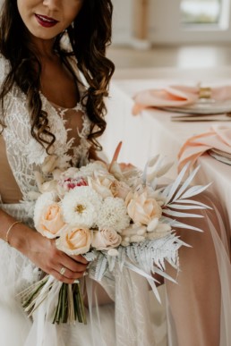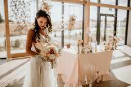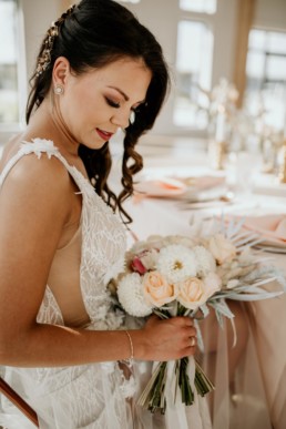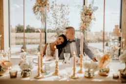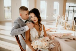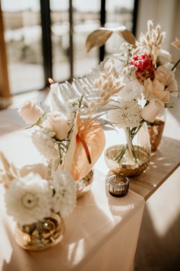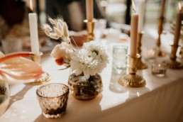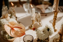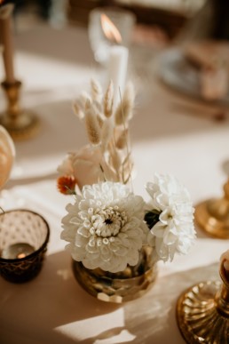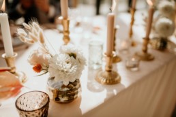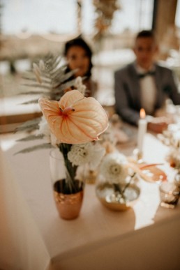 Przede wszystkim kwiaty w odcieniach moreli, bieli i złota idealnie komponują się z miedzianymi elementami. Takimi jak choćby ścianka, krzesła, sztućce czy wazony. Kolor coral w połączeniu z innymi barwami nadaje ciepłego i magicznego klimatu.