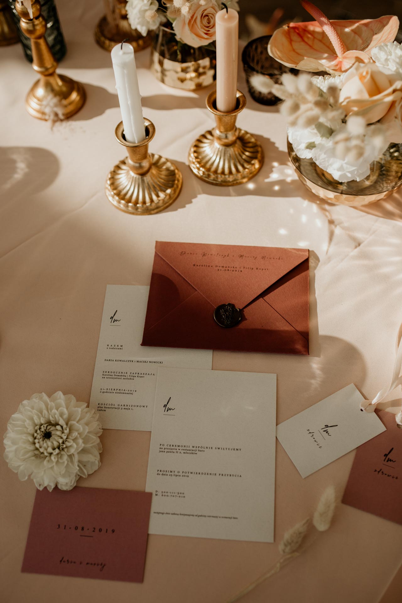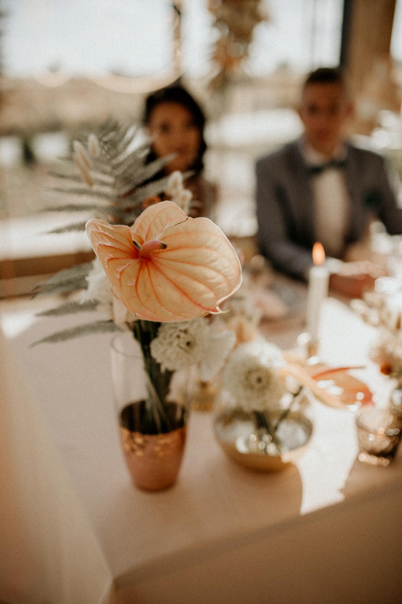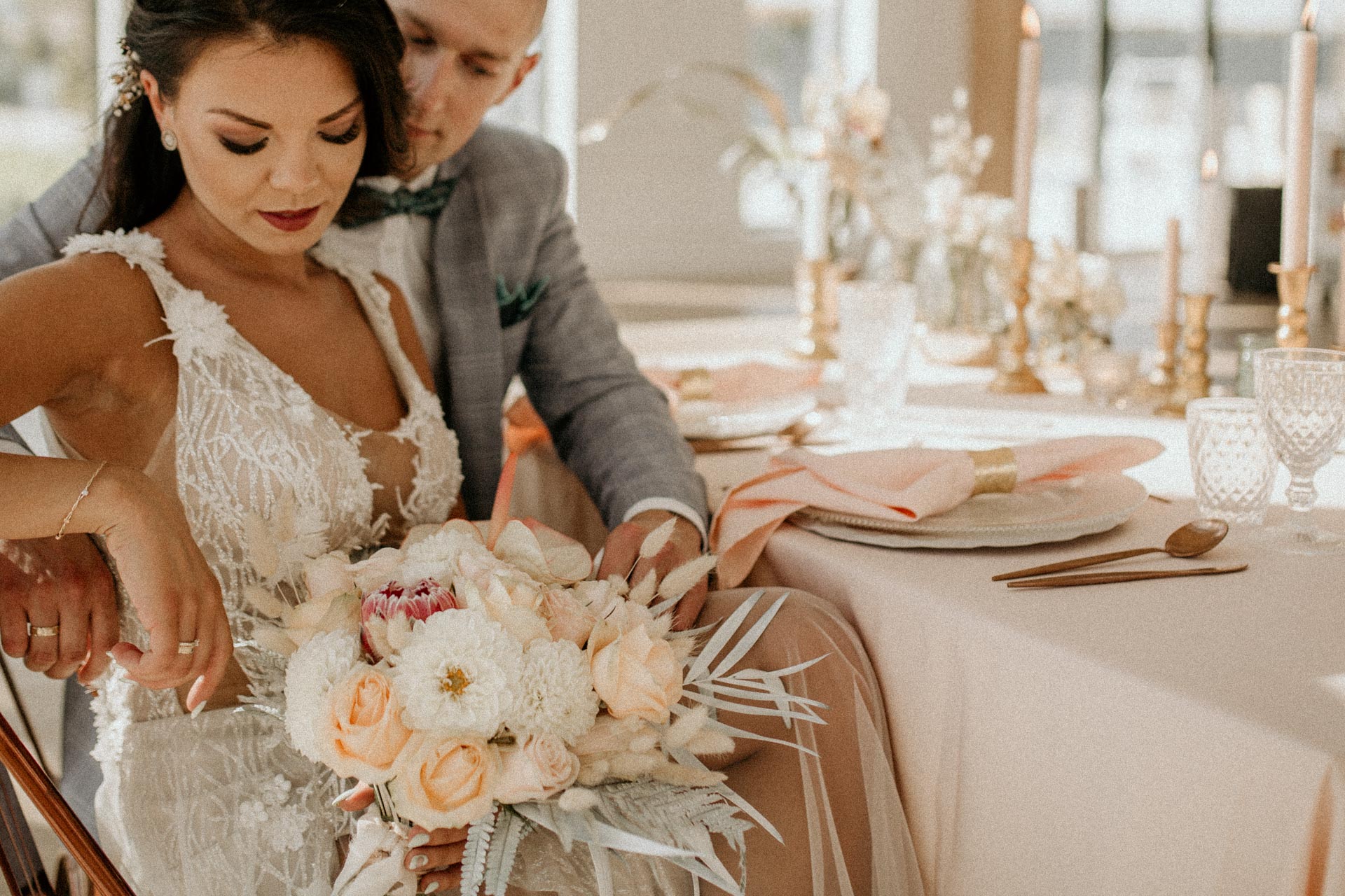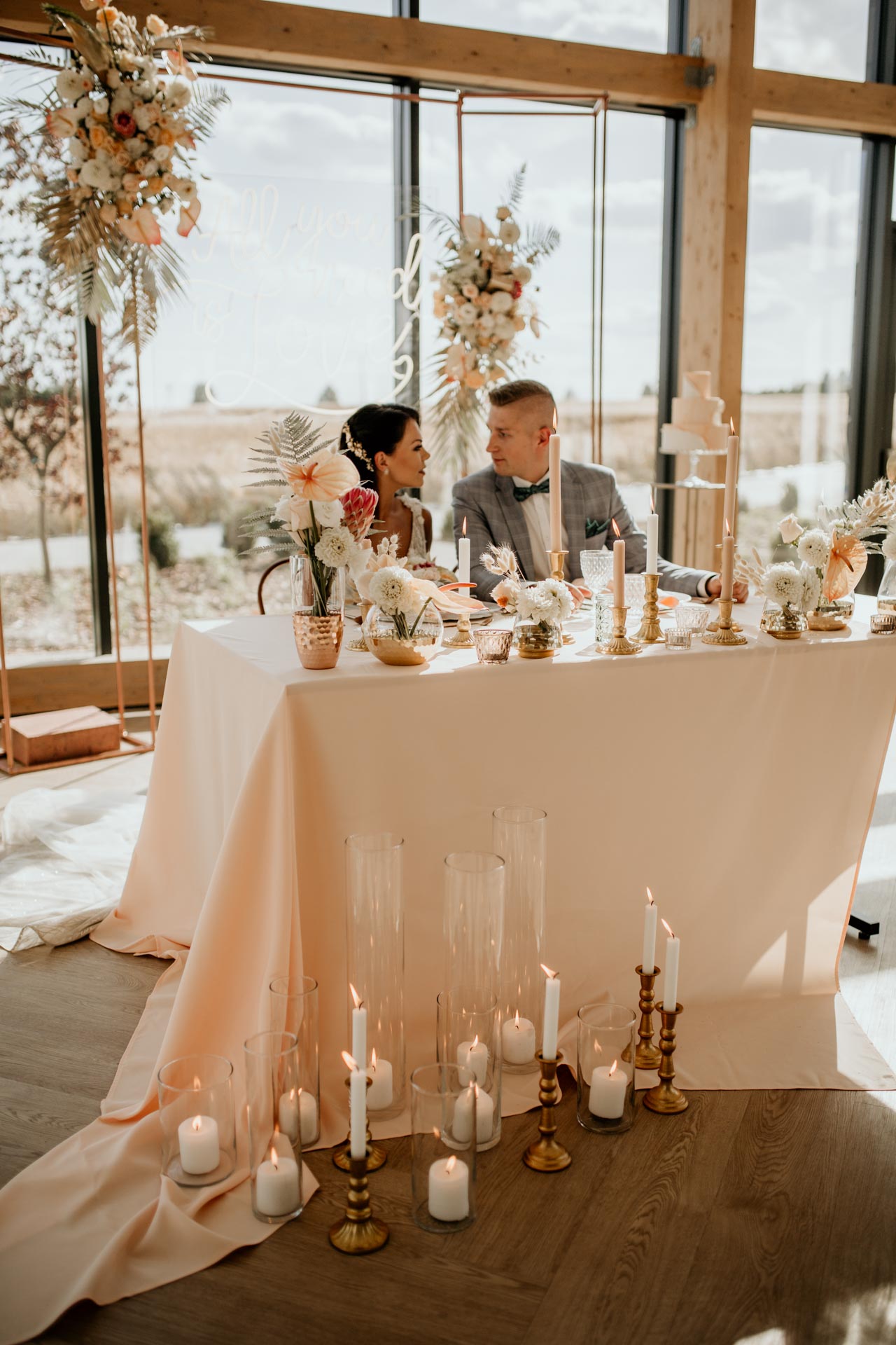 Przede wszystkim kwiaty w odcieniach moreli, bieli i złota idealnie komponują się z miedzianymi elementami. Takimi jak choćby ścianka, krzesła, sztućce czy wazony. Kolor coral w połączeniu z innymi barwami nadaje ciepłego i magicznego klimatu.