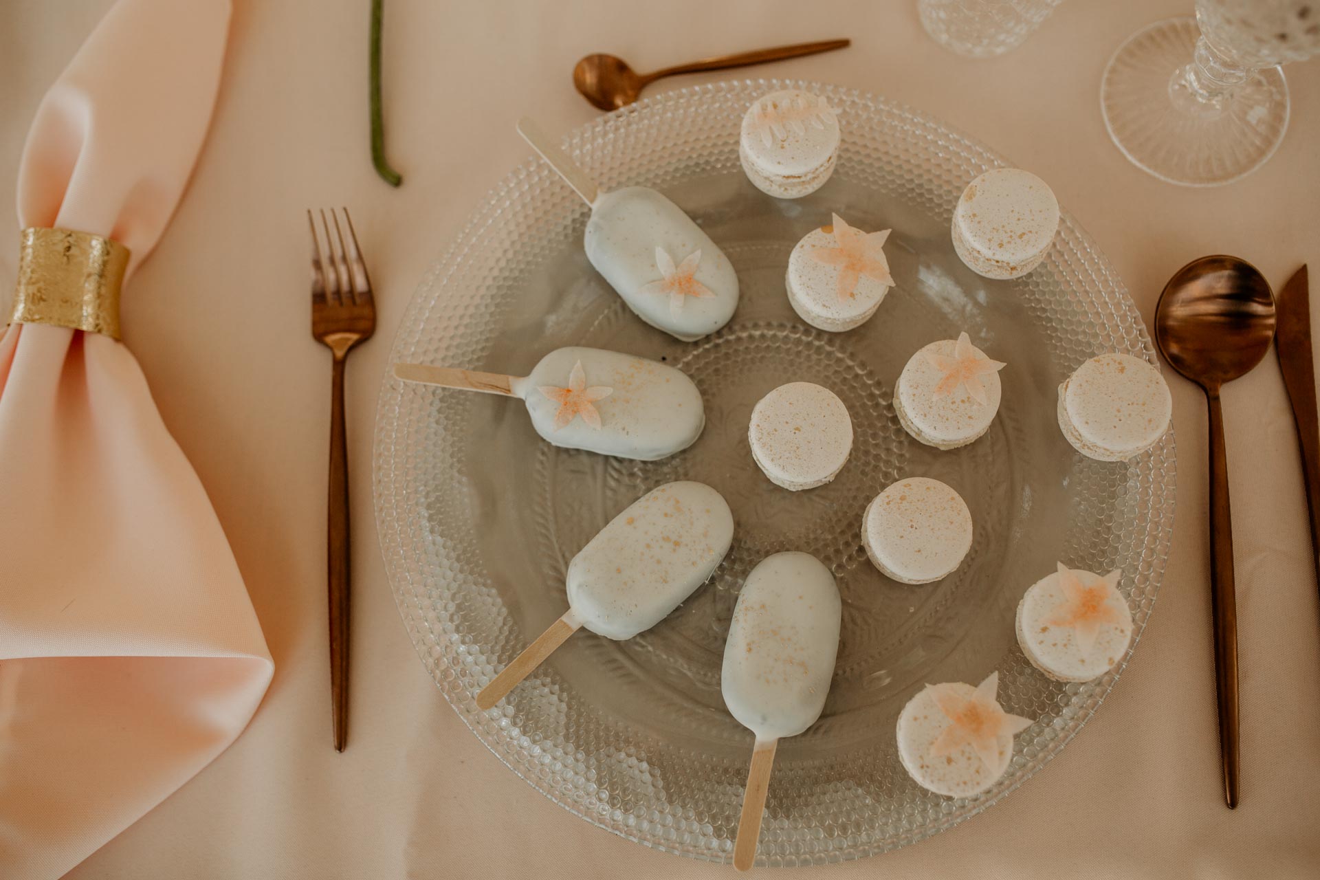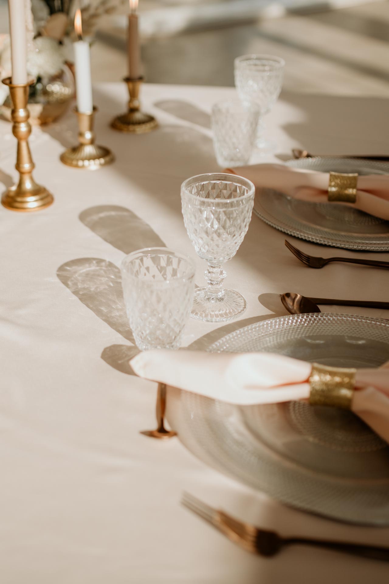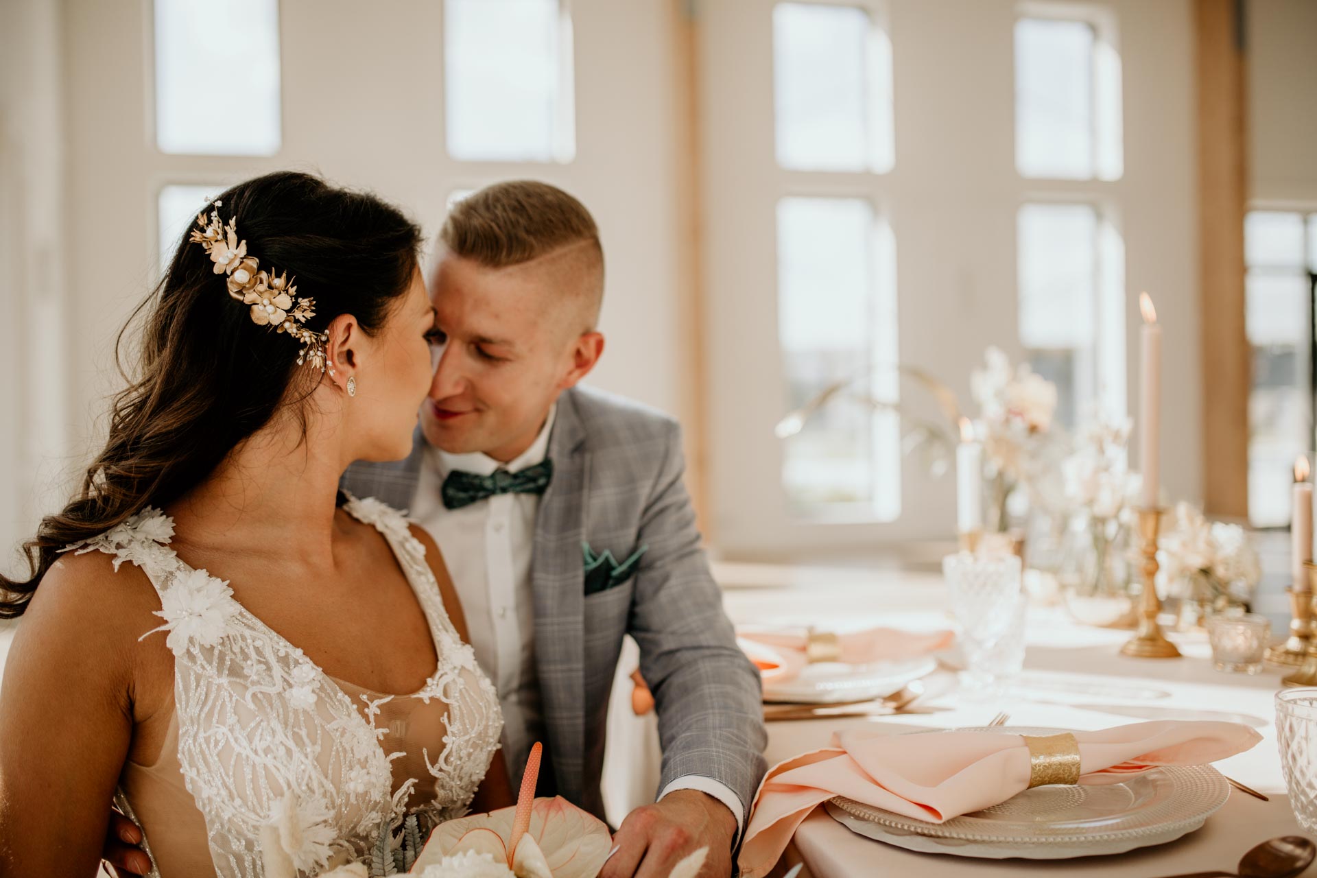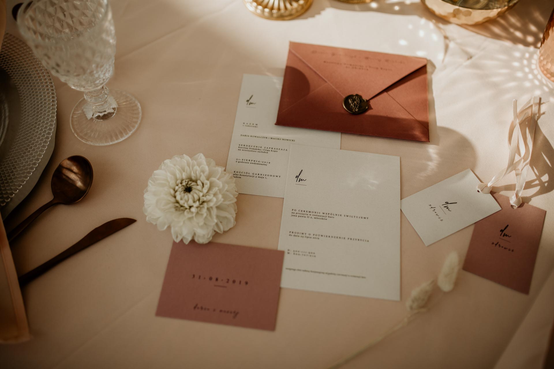 Przede wszystkim kwiaty w odcieniach moreli, bieli i złota idealnie komponują się z miedzianymi elementami. Takimi jak choćby ścianka, krzesła, sztućce czy wazony. Kolor coral w połączeniu z innymi barwami nadaje ciepłego i magicznego klimatu.