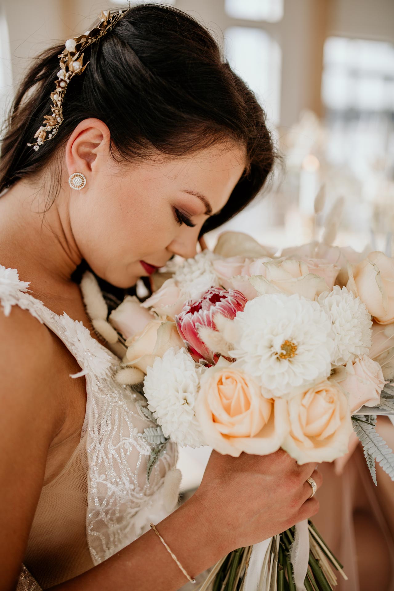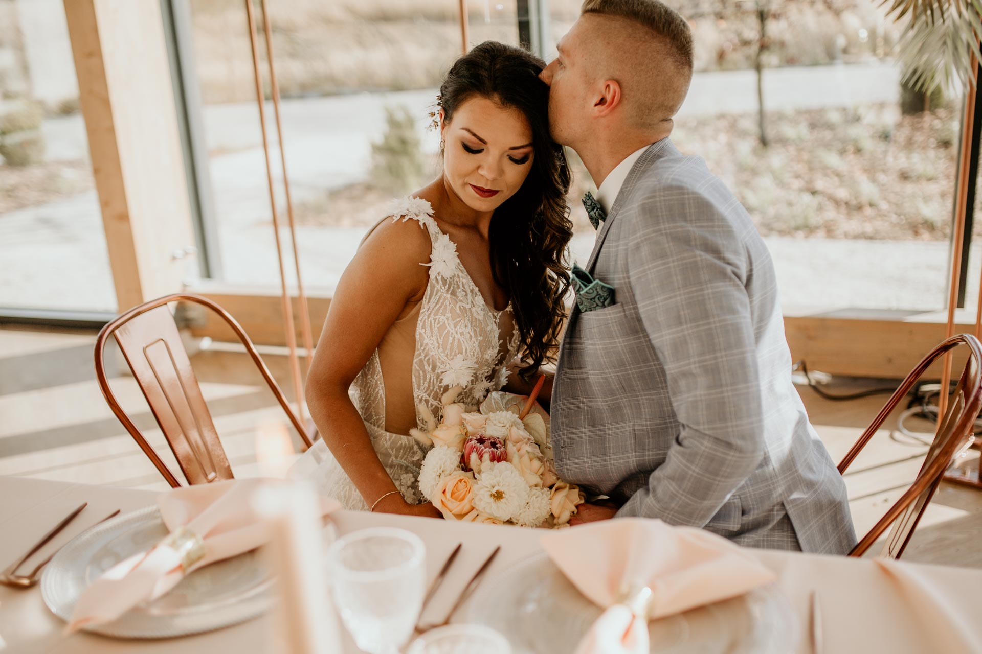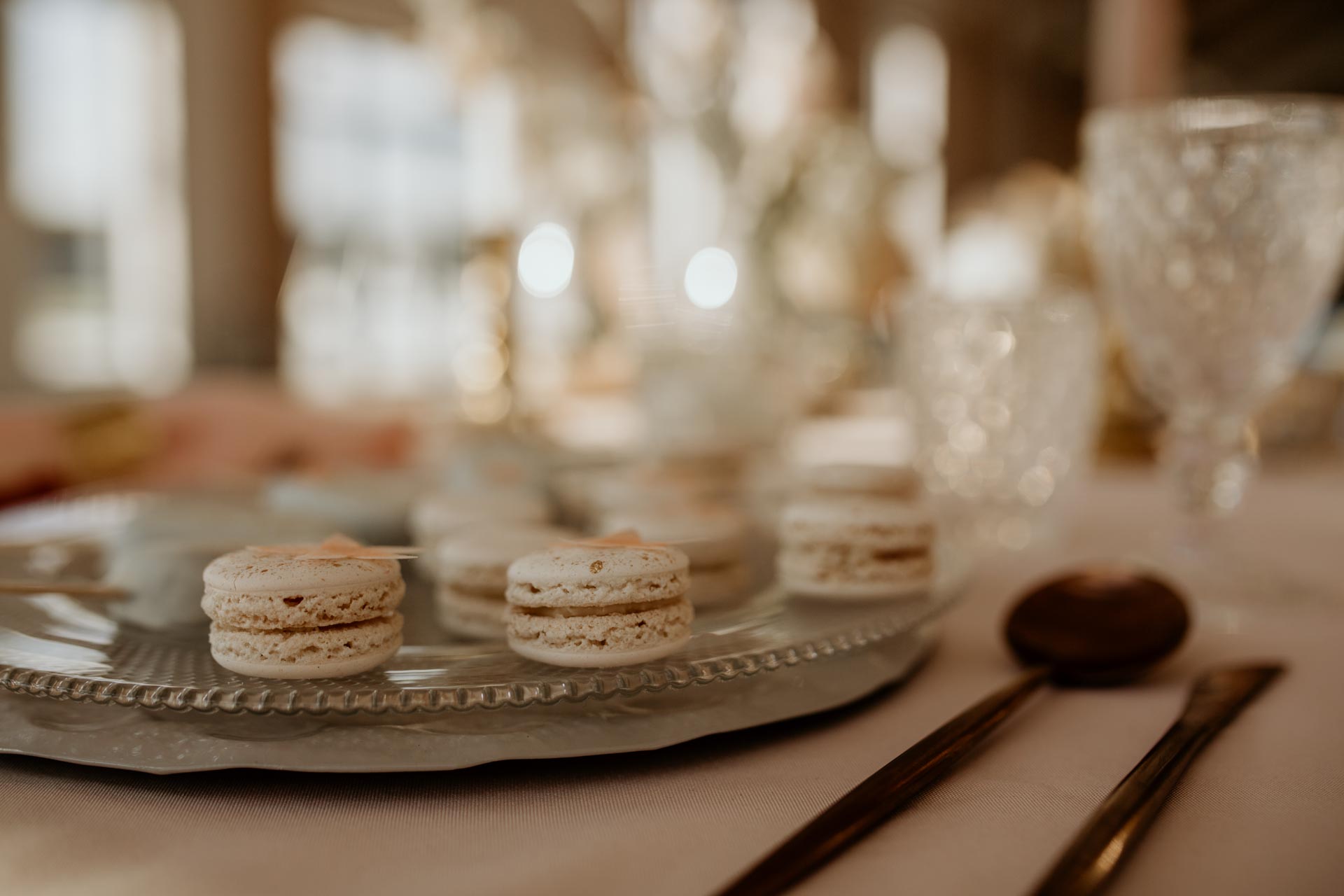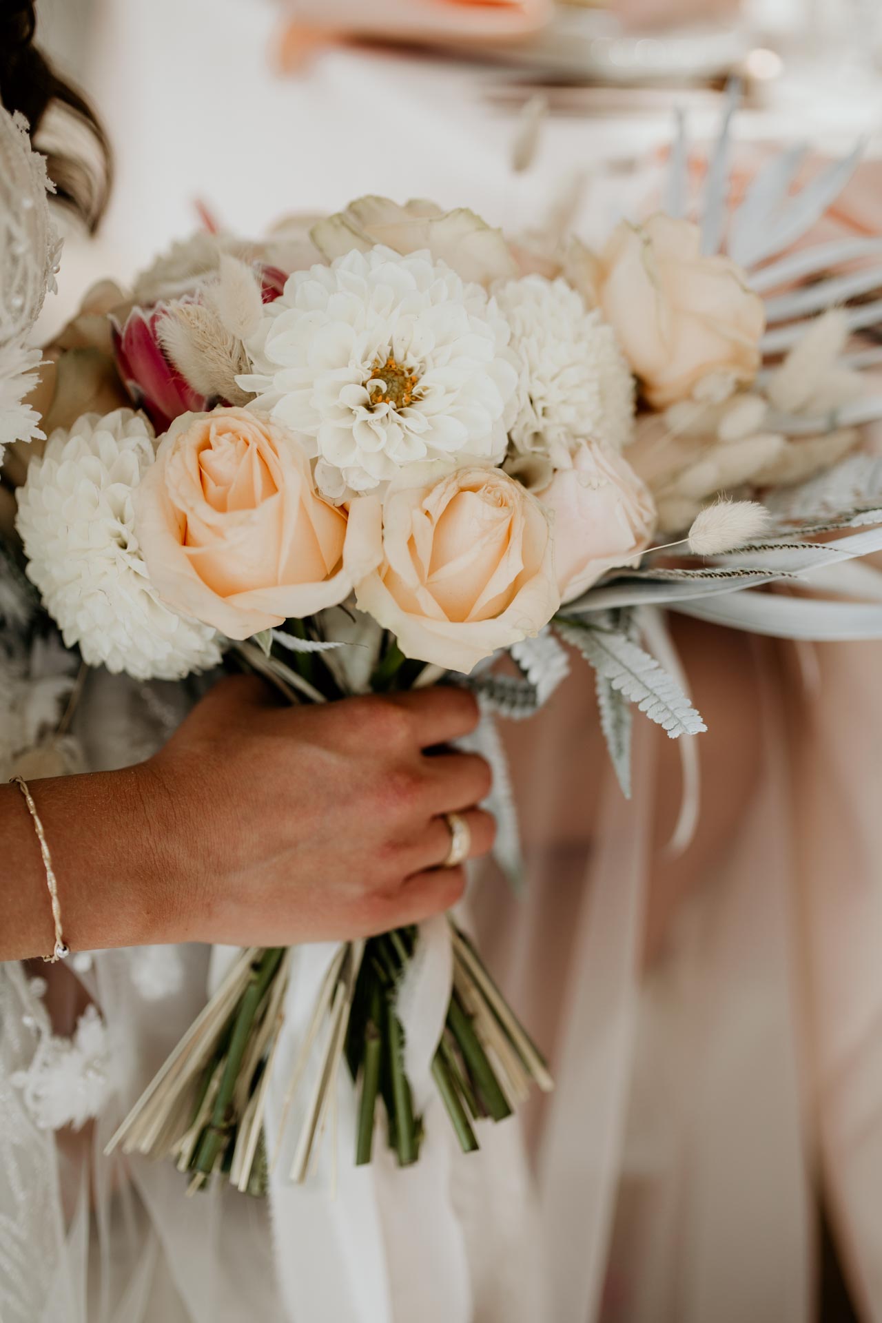 Przede wszystkim kwiaty w odcieniach moreli, bieli i złota idealnie komponują się z miedzianymi elementami. Takimi jak choćby ścianka, krzesła, sztućce czy wazony. Kolor coral w połączeniu z innymi barwami nadaje ciepłego i magicznego klimatu.